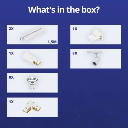 Beschrijving Complete Set 1-Fase Rail L 1,5 x 1,5 Meter Wit | incl. 8x Spot + GU10 2700K 3W Dimbaar + Eindkap, Voedingsconnector en L -Verbindingsstuk