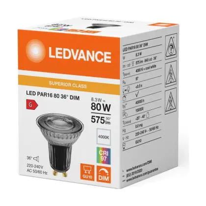 Beschrijving Ledvance LED PAR16 GU10 Reflector 8.3W 575lm 36D - 940 Koel Wit | Beste Kleurweergave - Dimbaar - Vervangt 80W
