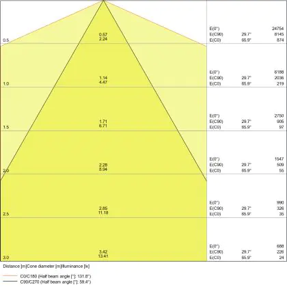 De lichtopbrengst (Lumen), geeft weer hoe krachtig het uitgestraalde licht is. Dit is belangrijk om te weten om de juiste sfeer te creëren. 0 tot 400 Lumen is bij uitstek geschikt voor accent- of sfeerverlichting. Een hoger aantal Lumen is, afhankelijk van de grootte van de ruimte, beter geschikt als ondersteunende- of basisverlichting. Heb je plafonds hoger dan 4 meter, dan is een lichtopbrengst van minimaal 8000lm aan te raden indien heldere verliching gewenst is (vb. in werkomgevingen).