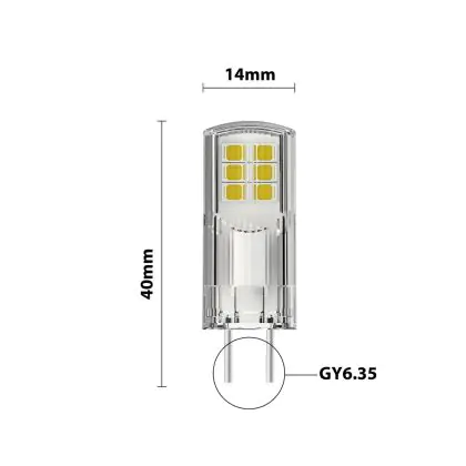 Deze GY6.35 LED lamp heeft een diameter van 14mm en is mm lang. Deze afmetingen zijn belangrijk om te weten, omdat GY6.35 LED steeklampjes doorgaans iets groter kunnen zijn dan conventionele GY6.35 halogeenspots. Door de afmetingen van deze GY6.35 LED lamp te vergelijken met je huidige lamp voorkom je dat je een nieuwe lamp koopt die niet in het betreffende armatuur past. Wel zo prettig is dat je bij de aankoop van dit product een Lampdirect All-in garantie krijgt van 2 jaar.
