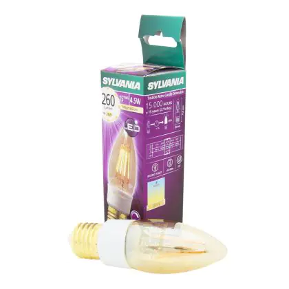 Beschrijving Sylvania ToLEDo E27 Kaars Filament Goud 4.5W 260lm - 817 Magmaglow | Dimbaar - Vervangt 40W